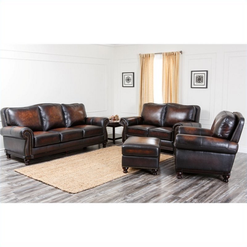 | Abbyson Living - Sofa Sets - CIN180BRN3214 - Abbyson Living Barclay 4 Piece Hand-Rubbed Leather Sofa Set in Espresso Designed in the USA; Upholstery materials: Hand Rubbed Leather Materials: Kiln-dried hardwood; Leather match on sides and back; No-sag sinuous spring cushioning; 2.2 high-density plush foam cushioning; Rolled Armrests and padded backrests; Hand-stitched details and Individually placed brass-colored nail head trims; Durable, quality construction and modern style that will enhance the look of any decor. Specifications:Overall Product Dimensions: 37 H x 86 W x 35 D.