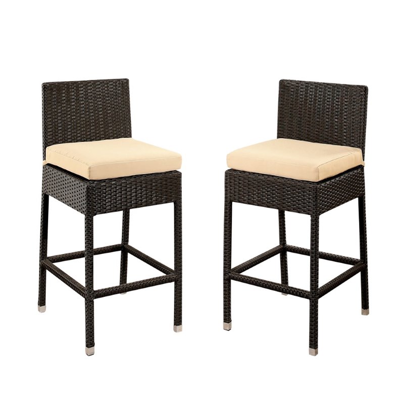 | Abbyson Living - Outdoor Bar Stools - DLRBC002ES2PCK - Enhance your outdoor area with these contemporary wicker bar stools. The sturdy iron frame complements the woven wicker seat creating a relaxing and comfortable design for guests to enjoy. The included beige cushions are sure to complete the stylish look. Finish: Espresso; Material: PE Wicker; Multi-tone brown colored wicker is perfect for outdoor setting; Iron construction provides sturdiness. Specifications:Overall Product Dimensions: 42 H x 18 W x 22 D; Overall Product Weight: 14.3 lbs.