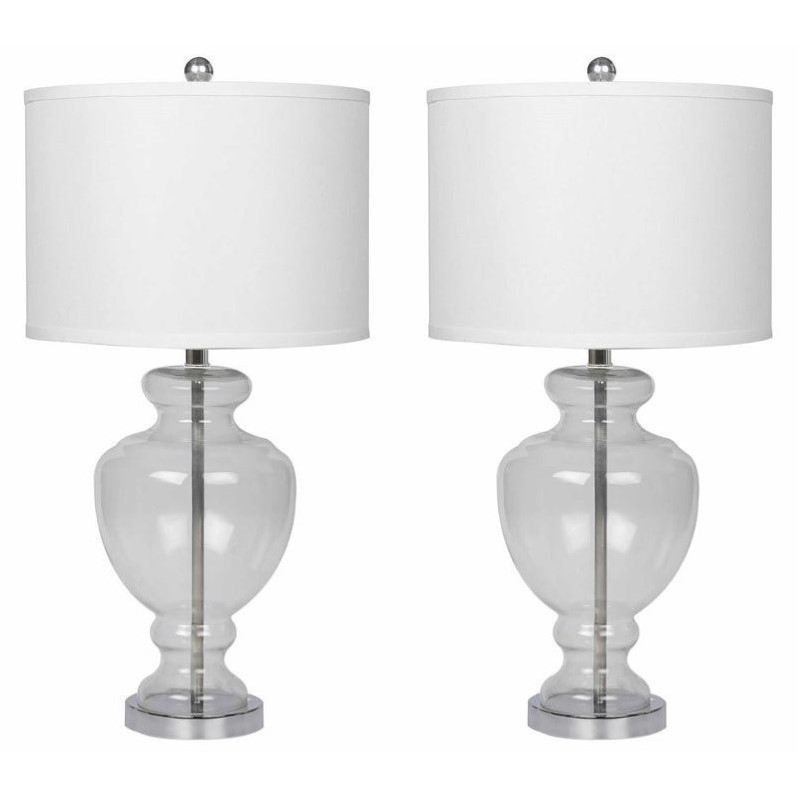 | Abbyson Living - Table Lamps - SP34236CLR2PCK - Setting: IndoorIncludes: Two (2) lampsShades: Ivory cottonSocket switchNumber of lights: 1Requires one (1) 150-watt bulb (not included)Clear Glass/MetalClear. Specifications:Assembled Dimensions: 28 H x 15 W x 15 DAssembled Weight: 10 lbs# of Cartons: 1Box Dimensions: 34.25 H x 17 W x 17 DCubic Feet: 4.2Loadability 20' Container: 261.9Loadability 40' HC Container: 559.52