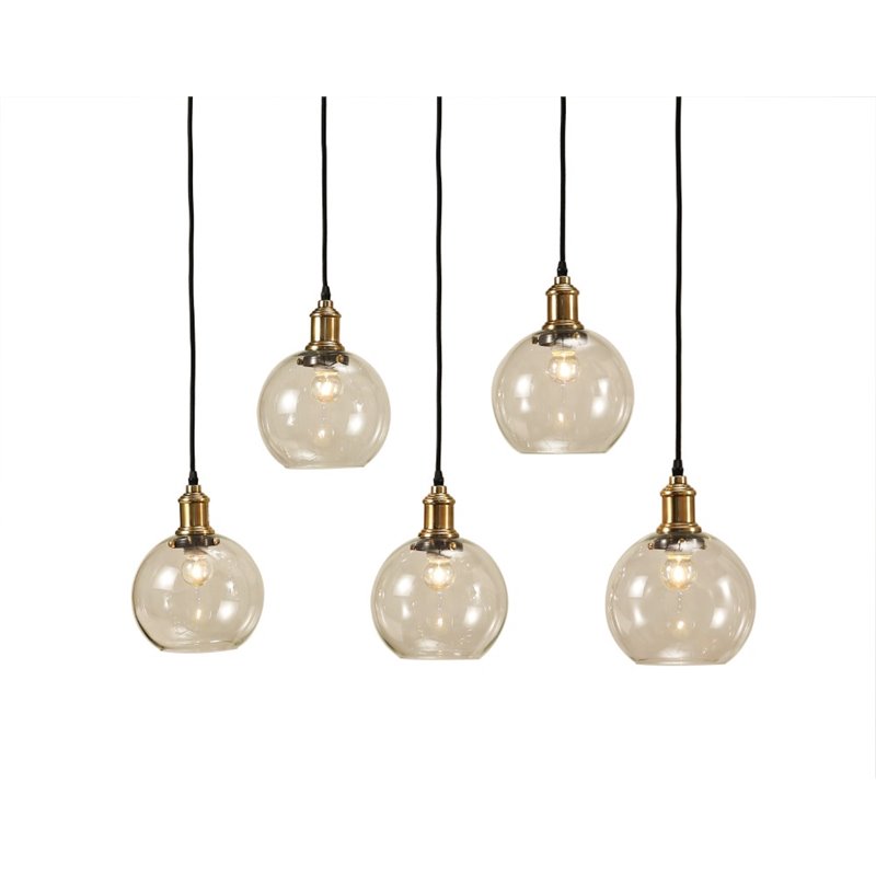 | Abbyson Living - Pendant - SHTD700385LVBNBLC - Five simple glass pendants highlight retro filament bulbs in this retro inspired chandelier. Brass fixtures drop from cords on an upper panel. Filament bulbs not included. Finish: ClearMaterial: GlassSetting: IndoorFixture Finish: ClearNumber of lights: Four (4)Requires Four (4) 60-watt, E12 socket, type B bulbs (not included).Specifications:Overall Product Dimensions: 18 H x 8 W x 8 DProduct Weight: 10 lbs