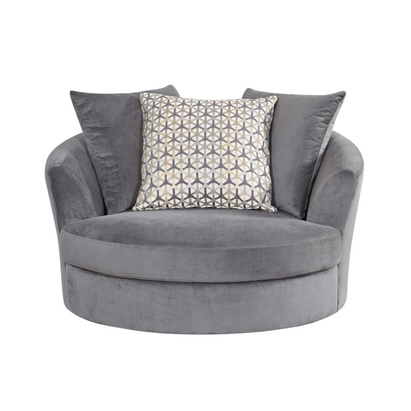| Abbyson Living - Gliders & Rockers - SK2921GRY1 - This round swivel chair will be the hot spot in your house. The comfortable 1.8 foam cushioning will make you want to fall asleep and take a nap. The polyester fabric is soft to the touch and the neutral tone will make it easy to transition with most decor styles. Finish: GrayMaterials: Foam and Pocket coil1.8-density foam with pocket coilCorner-blocked joineryHand-stitched detailsSwivel mechanismSpecifications:Overall Product Dimensions: 33 H x 50 W x 50 DProduct Weight: 90 lbs