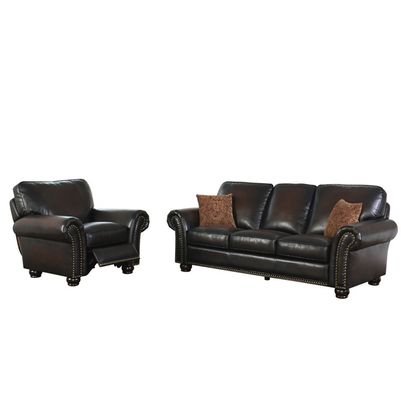 | Abbyson Living - Sofa Sets - SK2918BRN31 - The hand rubbed treatment of this leather seating set creates a vintage patina that adds warmth and depth to the leather. The traditional style is simple yet elegant, with the added detail of a nailhead trim. Coordinating tapestry pillows included on sofa and loveseat. Finish: Brown; Materials: Solid Hardwood,Hand Rubbed Bonded Leather; Upholstery color: Multi Dark Brown; High resiliency 2.0-density foam cushioning for added comfort and support; Corner-blocked joinery; Hand-stitched details; Set Includes: Sofa and Pushback Recliner. Specifications:Sofa Dimensions: 37 H x 86 W x 38 D; Recliner Dimensions: 37 H x 43 W x 38 D; Product Weight: 141 lbs.