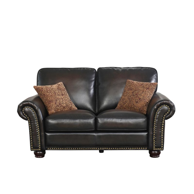 | Abbyson Living - Loveseats - SK2918BRN2 - The hand rubbed treatment of this leather loveseat creates a vintage patina that adds warmth and depth to the leather. The traditional style is simple yet elegant, with the added detail of a nailhead trim. Coordinating tapestry pillows included. Matching sofa and recliner also available. Finish: BrownMaterials: Solid HardwoodUpholstery Materials: Hand Rubbed Bonded LeatherUpholstery color: Multi Dark BrownHigh resiliency 2.0-density foam cushioning for added comfort and supportCorner-blocked joineryHand-stitched detailsSpecifications:Loveseat Dimensions: 37 H x 65 W x 38 DSeat Depth: 22.5Seat Height: 20Product Weight: 108 lbs