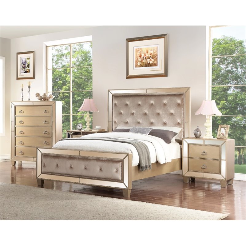 | Abbyson Living - Bedroom Sets - RKB7774PCQ - Bring Hollywood glamour to your bedroom with this fashionable bedroom set. Crafted of sturdy hardwoods, painted a matte gold and accented with mirrored trim. Headboard and footboard are padded in a luxe champagne velvet and finished with a nailhead trim. Set includes headboard, footboard and rails, two nightstands and five drawer chest. Full range of coordinating items also available.Finish: Gold; Materials: Solid Rubberwood, Acacia Solid and Mirrored Panels; Set includes 1 bed, 2 nightstands and 1 chest ; Champagne Finish and Champange Viscose fabric; Hand-finished; All case goods feature metal ball bearing gliders; English dovetail joints for drawer construction and soft Closing Drawers for easy use; Zayneern style. Specifications:Queen Bed Dimensions: 64 H x 64 W x 92 D; Nightstand Dimensions: 30 H x 28 W x 17 D; Nightstand Dimensions: 30 H x 28 W x 17 D; Chest Dimensions: 56 H x 42 W x 18 D; Product Weight: 38 lbs.