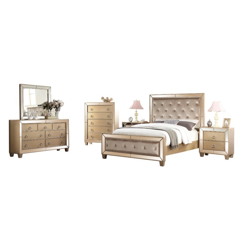| Abbyson Living - Bedroom Sets - RKB7776PCCK - Bring Hollywood glamour to your bedroom with this fashionable bedroom set. Crafted of sturdy hardwoods, painted a matte gold and accented with mirrored trim. Headboard and footboard are padded in a luxe champagne velvet and finished with a nailhead trim. Set includes headboard, footboard and rails, two nightstands, five drawer chest, and seven drawer dresser with mirror. Full range of coordinating items also available.Finish: Gold; Materials: Solid Rubberwood, Acacia Solid ; Set includes 1 bed, 2 nightstands, 1 dresser, 1 mirror and 1 chest ; Champagne Finish and Champange Viscose fabric; Hand-finished; All case goods feature metal ball bearing gliders; English dovetail joints for drawer construction ; Soft Closing Drawers for easy use; Zayneern style. Specifications:Nightstand Dimensions: 30 H x 28 W x 17 D; California King Bed Dimensions: 64 H x 76 W x 96 D; Chest Dimensions: 56 H x 42 W x 18 D; Mirror Dimensions: 38 H x 42 W x 2 D; Dresser Dimensions: 38 H x 64 W x 18 D; Product Weight: 42 lbs.