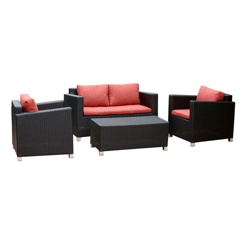| Abbyson Living - Outdoor Sofa Sets - DLRS020RED4PC - Finish: BlackMaterials: PE wicker, Powder coated iron frame, Water-resistant cushions, Set includes: One sofa, one coffee table, two chairsSturdy constructionNeutral colors to match any decorPerfect for poolside, your deck, or backyard spaceSpecifications:Sofa Dimensions: 27.5 H x 50.5 W x 26 DChair Dimensions: 27.5 H x 29.5 W x 26 DCoffee table Dimensions: 14 H x 36 W x 20 D
