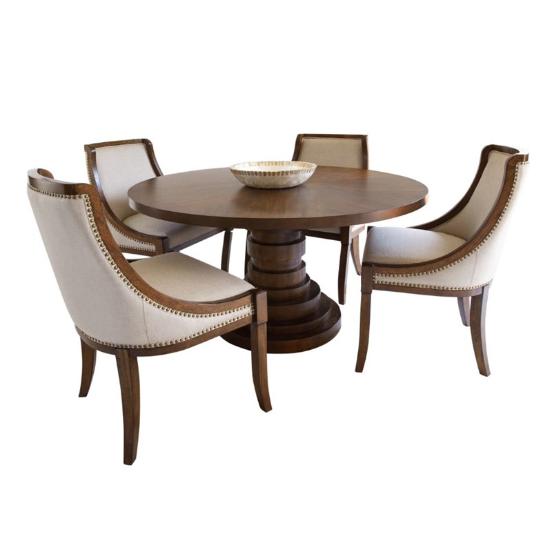 | Abbyson Living - Dining Sets - RK45525PC - Bring modern scuplture to your dining room with this unique pedestal table. Crafted of solid rubberwood with acacai veneer, the table features a hand carved base. Ivory linen chairs are framed in the same warm acacai veneer. Set includes table and four chairs. Coordinating buffet also available.Finish: Acacai Brown; Materials: Solid Rubberwood Construction and Acacai Veneer; Detailed Tier Base; Detailed hand carving on the Table top; Brass Nailhead trimmings on dining chairs; Set includes 1 Dining Table and 4 Dining chairs. Specifications:Dining Table Dimensions: 30 H x 56 W x 56 D; Dining Chair Dimensions: 38 H x 27 W x 23 D; Product Weight: 170 lbs.