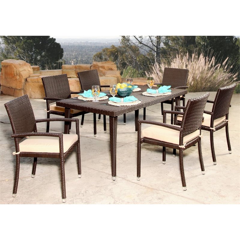 | Abbyson Living - Patio Dining Sets - DLRD015ES7PC - Enjoy outdoor dining and relaxation with this stylish 7 piece outdoor dining set. Constructed of beautiful resin wicker, this durable and comfortable set will put outdoor dining into a whole new level. With a sturdy powder coated iron frame, this set is s Finish: EspressoMaterial: Resin WickerBeige-color cushions includedSpecifications:Table Dimensions: 28 H x 63 D x 35 WChair dimensions: 35 H x 22.4 W x 25 DOverall Product Weight: 100 lbs