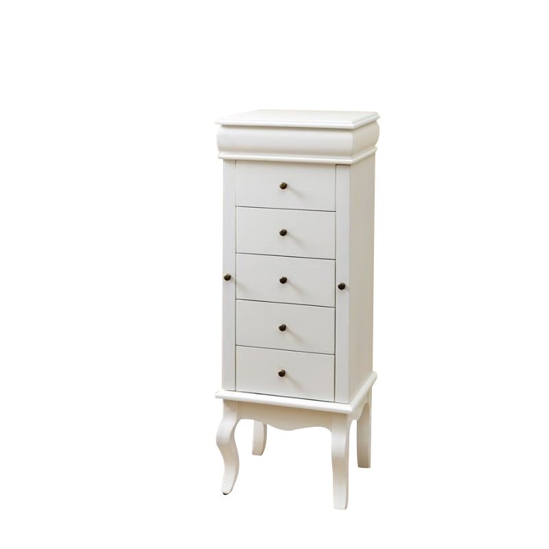 | Abbyson Living - Jewelry Armoires - MD30147WHT - Hand-FinishedSlat Pack for Added Comfort5 drawers1 Storage area on topSides open up for additional storage with jewlery hooks White, Gold Knobs Kiln-Dried Solid WoodWhite, Gold Knobs 40 inches high x 14 inches wide x 11.75 inches deep. Specifications:Assembled Dimensions: 40 H x 14 W x 11.7 DAssembled Weight: 11 lbs# of Cartons: 1Box Dimensions: 36.22 H x 14.17 W x 16.93 DCubic Feet: 4.9Loadability 20' Container: 224.49Loadability 40' HC Container: 479.59