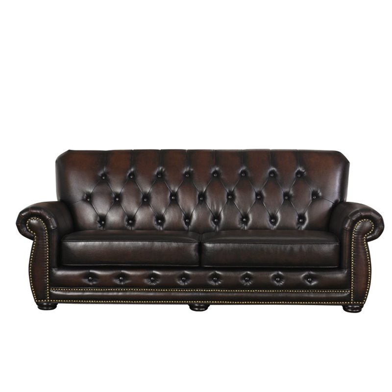| Abbyson Living - Sofas - SK2925BRN3 - This tufted leather sofa is reminiscent of something you might find in the library of a grand estate. Warm hand rubbed leather has tufted detailing on seat back and skirt. Nailhead trim adds the final detail. Grab your favorite book and settle in. Finish: BrownMaterials: Solid Hardwood, Hand Rubbed Bonded LeatherUpholstery color: Multi Dark BrownHigh resiliency 2.0-density foam cushioning for added comfort and supportCorner-blocked joineryHand-stitched detailsSpecifications:Overall Product Dimensions: 36 H x 86 W x 39 DSeat Height: 18.5 Seat Depth: 23.5 Product Weight: 122 lbs