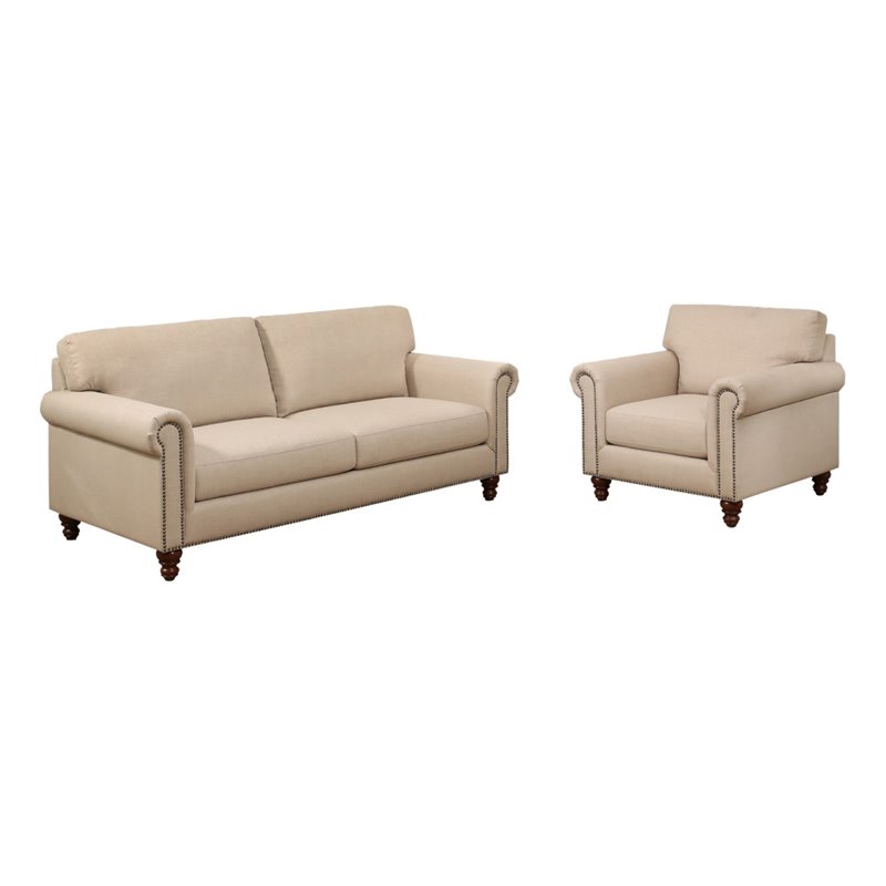 | Abbyson Living - Sofa Sets - KS073IVY31 - This sofa and amrchair set will add extra seating for guests while making a stylish statement in your home. Construscted of solid hardwood and upholstered in polyester with brass nailhead trims along each piece, this set will go with current décor. Finish: Ivory; Materials: Solid Hardwood Frame, 100% Polyester Fabric; Brass nailheads; 2.0 High density foam . Specifications:Sofa Dimensions:34 H x 80 W x 37 D; Armchair Dimensions: 34 H x 37 W x 37 D; Sofa Weight: 104 lbs.