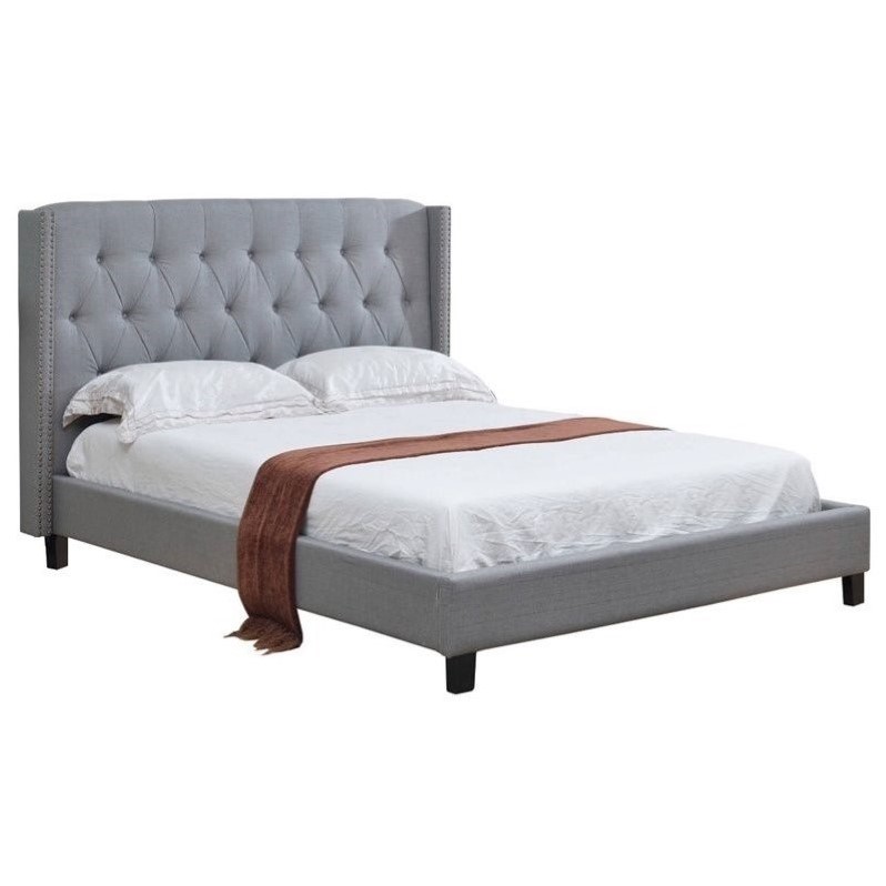 | Abbyson Living - Beds - KM14BA063GRYFU - Set includes: One (1) headboard, one (1) footboard, one (1) set of rails, one (1) complete euro slatsWingback designNailhead trimGrey Poplar Wood, Linen Grey 49 inches high x 59 inches wide x 81 inches deepHeadboard height: 49 inchesFootboard height: 12 inches. Specifications:Assembled Dimensions: 49.02 H x 58.66 W x 81.1 DAssembled Weight: 106 lbs# of Cartons: 2Box 1 Dimensions: 9 H x 48 W x 67 DBox 1 Weight: 70 lbsLoadability 20' Container: 67.57Loadability 40' HC Container: 144.35Box 2 Dimensions: 7 H x 11 W x 80 DBox 2 Weight: 60 lbsLoadability 20' Container: 290.24Loadability 40' HC Container: 620.05