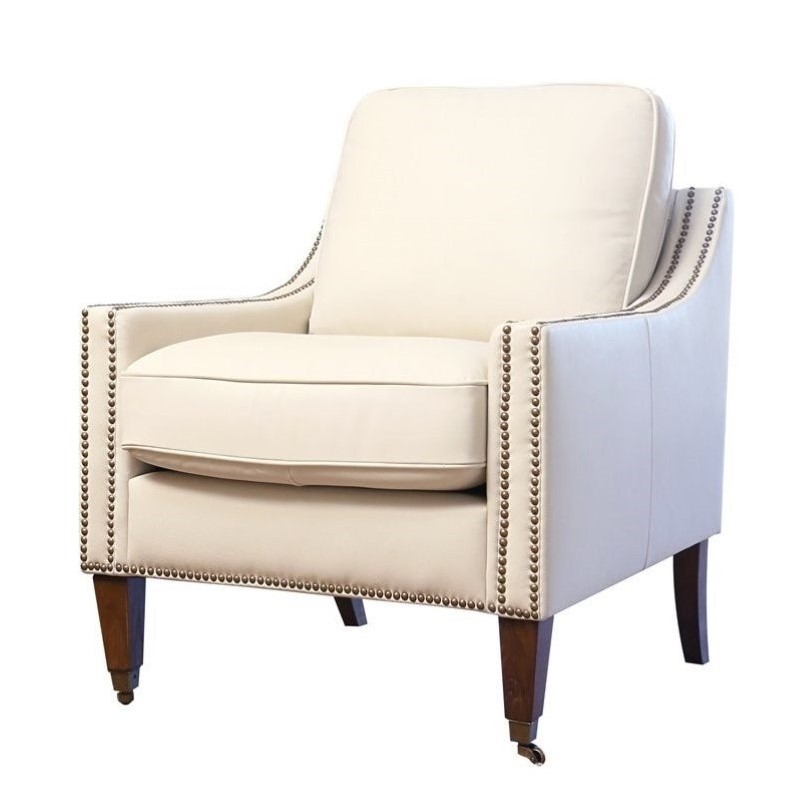 | Abbyson Living - Accent Chairs - MP3321IVY1 - The simplicity, elegance and sophistication of this singularly outstanding piece will make it visually appealing in any home. Luxuriously detailed, the convergence of the double nail-head trims and the sleek low arms create a classy chic feel. The opulent leather upholstery gracefully contours the body giving it a relaxed feel. Inviting seat cushions are fully padded with high resiliency foam and wrapped in Dacron fill, providing a lifetime of support and comfort. Its durable kiln-dried hardwood frame is handled with a great deal of care and is put together by a unique and highly skilled craftsman to ensure longevity and strength as well as long-term comfort and satisfaction. Lastly, the beautifully crafted caster legs provide this sofa easy mobility. Materials: Kiln-Dried Hardwood frame; Upholstery Materials: Bonded Leather on all seating areas and armrests and leather splits on front rails, sides and back; Upholstery Color: Ivory; Upholstery fill: High resiliency 2.0-Density foam cushioning that is wrapped in a Dacron fill for added comfort and support.; The frames are foam-encased, corner braced and blocked to help preserve structure; Double brass-colored nail-head trims design; No-sag sinuous spring construction; Armchair dimensions: 29 inches wide x 35 inches deep x 37 inches high; Seat height: 19 inches; Seat depth: 22 inches. Specifications:Assembled Dimensions: 37 H x 29.1 W x 35.4 D; Assembled Weight: 73 lbs; # of Cartons: 1; Box Dimensions: 24.4 H x 35.4 W x 29.9 D; Cubic Feet: 14.8; Loadability 20' Container: 74.32; Loadability 40' HC Container: 179.05 .