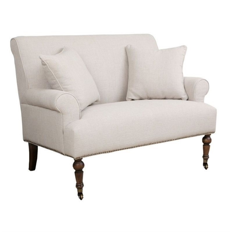 | Abbyson Living - Loveseats - MP3324GRY - Give your home a stylish dose of elegance with this exquisite linen settee. Bronze nail-head accents contour the rich fabric upholstery for a clean, simple look. The inviting seat cushions are fully padded with high resiliency foam and wrapped in a Dacron fill. Its durable kiln-dried hardwood frame is handled with a great deal of care and is put together by a unique and highly skilled craftsman to ensure longevity and strength as well as long-term comfort and satisfaction. Materials: Kiln-Dried Hardwood frameUpholstery Materials: Linen FabricUpholstery Color: GreyUpholstery fill: High resiliency 2.0-Density foam cushioning that is wrapped in a Dacron fill for added comfort and support.The frames are foam-encased, corner braced and blocked to help preserve structureBrass-colored nail-head trims for a classy feeIncludes two (2) throw pillowsNo-sag sinuous spring constructionOverall dimensions: 50 inches wide x 35 inches deep x 37 inches highSeat depth: 21.5 inchesSeat height: 19.5 inches. Specifications:Assembled Dimensions: 37 H x 50.4 W x 34.6 DAssembled Weight: 64 lbs# of Cartons: 1Box Dimensions: 33.5 H x 34.6 W x 50.4 DCubic Feet: 33.9Loadability 20' Container: 32.45Loadability 40' HC Container: 78.17
