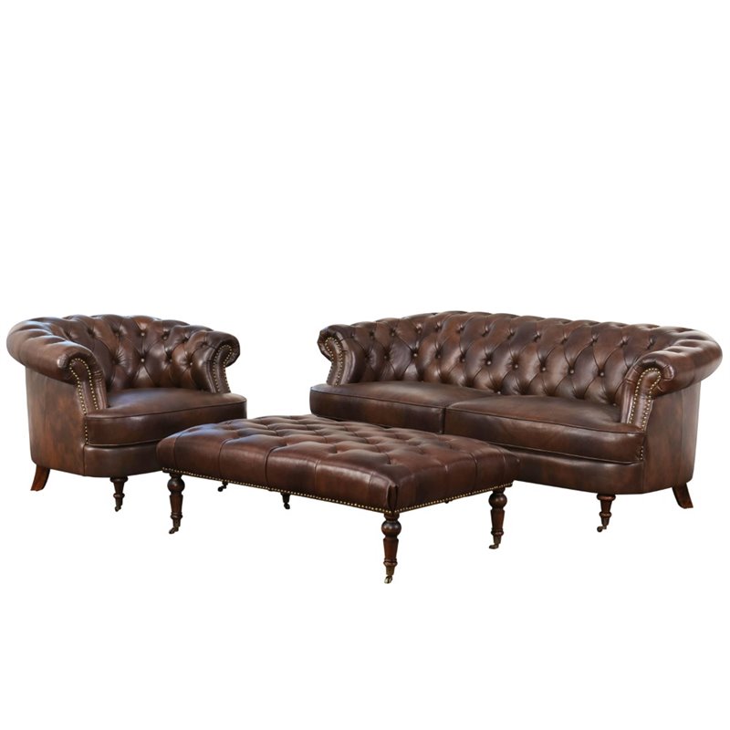 | Abbyson Living - Sofa Sets - SK2930BRN314 - Add formal seating to your living space with this 3 piece sofa set. Upholstered in top grain leather, this sofa set is tufted with rolled arms. The hardwood legs have castors and offer a brass nailhead trim along each piece. Set up in your front room or den to have intimate conversations with friends and family. Finish: Brown; Materials: Kiln-dried hardwood, Top Grain Leather; Upholstery color: Two tone chestnut brown; Leather match used on sides and back; Kiln dried hardwood frames; High resiliency 2.0-density foam cushioning for added comfort and support; Corner-blocked joinery; Brass nailhead trimmings and castor legs; Tufted back cushions. Specifications:Overall Product Dimensions: 31 H x 80 W x 38 D; Sofa Dimensions: 31H x 86 W x 39 D ; Ottoman Dimensions: 18 H x 50 W x 30 D; Armchair Dimensions: 31 H x 41 W x 38 D; Product Weight: 137 lbs.