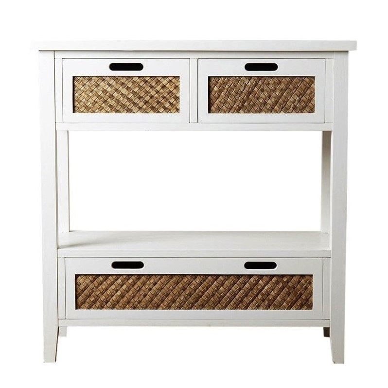 | Abbyson Living - Console Tables - MDM42018WHT - Drawers: Two (2) top drawers, One (1) bottom drawerWhite Wood, wickerWhite 34 inches high x 33 inches wide x 14 inches deep. Specifications:Assembled Dimensions: 33.8 H x 33.1 W x 13.7 DAssembled Weight: 19 lbs# of Cartons: 1Box Dimensions: 22 H x 17 W x 36 DCubic Feet: 7.4Loadability 20' Container: 148.65Loadability 40' HC Container: 317.57