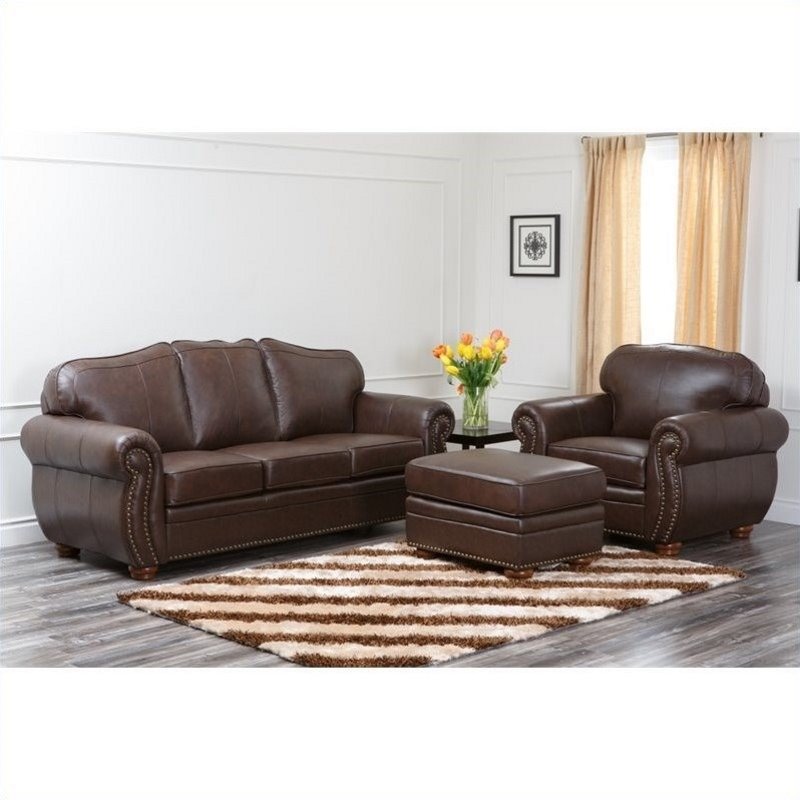 | Abbyson Living - Sofa Sets - CID320BRN3/1/4 - Sit back and experience true luxury. The Perla collection by Abbyson Living features opulent leathers and a smooth, luscious curvature of traditional design that cradles you perfectly the moment you sink into the seat. The intimate details of this piece, such as the intricate nailhead trim, simply beckon you to every moment of intimate relaxation. Set Includes One (1) sofa; One (1) armchair; One (1) ottoman . Kiln-dried solid hardwood frame; Top-grain genuine Italian leather upholstery seats; Leather match on sides and back; High resiliency 2.2 density foam cushioning for added comfort and support; No-sag sinuous spring construction; Rolled armrests feature hand-woven curvatures; Individually placed brass-colored nail-head trims ; Corner-block joinery; Designed in USA . Specifications: Sofa: 38” H x 84” W x 37” D; Armchair: 38” H x 44” W x 37” D; Ottoman: 20” H x 30” W x 25” D.