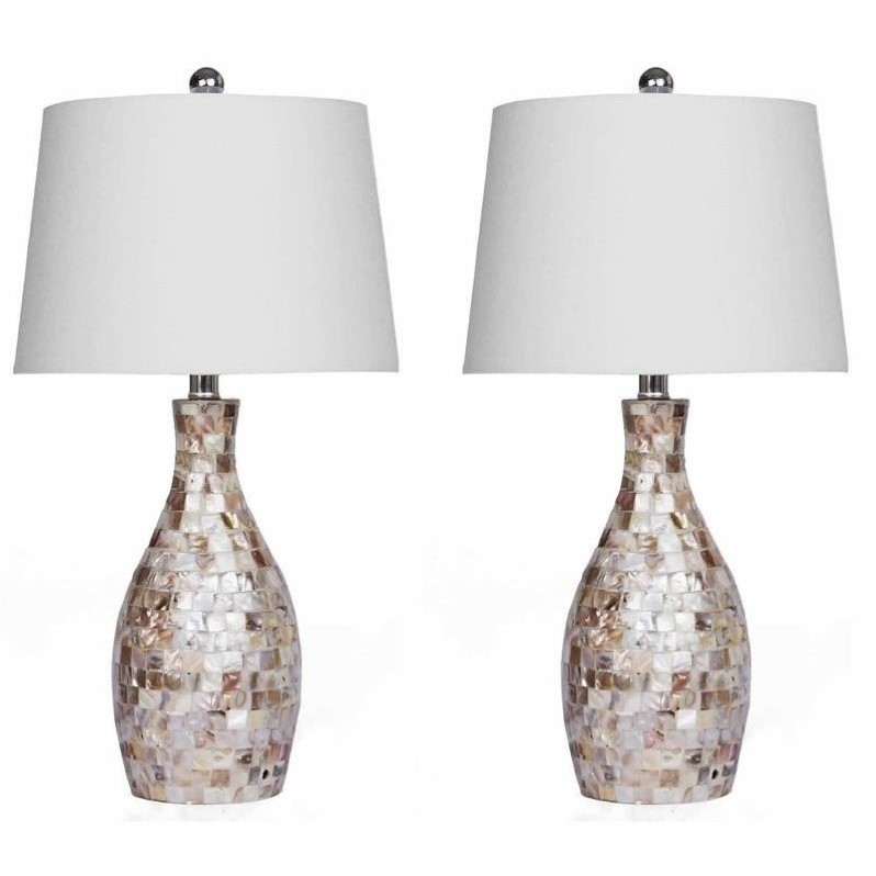 | Abbyson Living - Table Lamps - SP483342PCK - Setting: IndoorIncludes: Two (2) LampsShades: Beige cotton shadeOn/off: Socket switchRequires one (1) 60-watt bulb (not included)Mother of pearls Resin. Specifications:Assembled Dimensions: 26 H x 13.5 W x 13.5 DAssembled Weight: 7 lbs# of Cartons: 1Box Dimensions: 20 H x 13 W x 13 DCubic Feet: 2Loadability 20' Container: 550Loadability 40' HC Container: 1175
