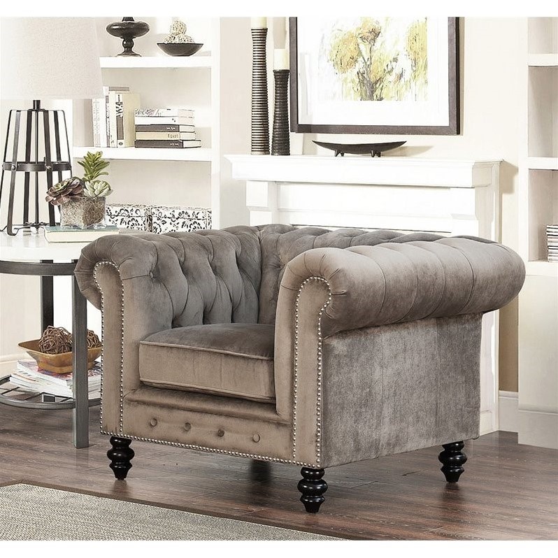 | Abbyson Living - Accent Chairs - SK2903V13GRY1 - Masterfully constructed with allover button tufting, silver nail-head accents and plush seating this sofa will upgrade the look of any home. The rich fabric upholstery gracefully contours the frame making it particularly inviting. The cushions are fully padded with high resiliency foam that is wrapped in a Dacron fill for ultimate comfort and support. Its durable kiln-dried hardwood frame is handled with a great deal of care and is put together by a unique and highly skilled craftsman to ensure longevity and strength as well as long-term comfort and satisfaction. Materials: Kiln-Dried Hardwood frameUpholstery Materials: Polyester Velvet UpholsteryUpholstery Color: GreyUpholstery fill: High resiliency 2.0-Density foam cushioning that is wrapped in a Dacron fill for added comfort and support.The frames are foam-encased, corner braced and blocked to help preserve structurePocket coil seatingButton tufted design44 inches deep x 37 inches wide x 31 inches hghSeat measures 18 inches highSeat is 23 inches deep. Specifications:Assembled Dimensions: 30.7 H x 44.1 W x 37.4 DAssembled Weight: 85 lbs# of Cartons: 1Box Dimensions: 26.4 H x 38.2 W x 44.9 DCubic Feet: 25.8Loadability 20' Container: 42.64Loadability 40' HC Container: 102.71