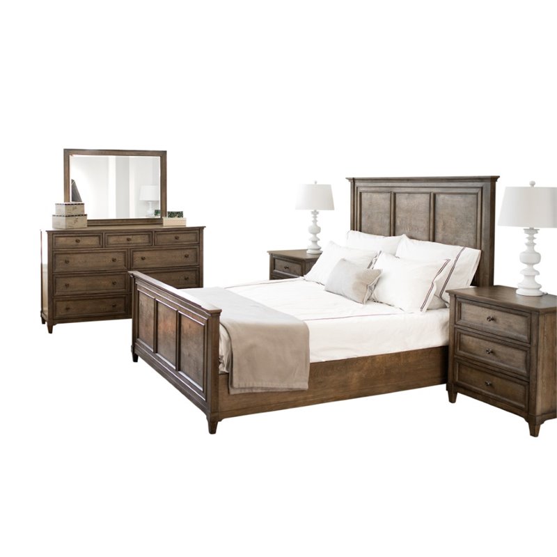 | Abbyson Living - Bedroom Sets - RK43315PCQ - Farmhouse style can be yours with this weathered oak bedroom set. Sturdy rubberwood features simple lines and architectural detail. Slatted bed frame requires the use of a box spring. Set includes headboard, footboard and rails, two nightstands and 9 drawer dresser with mirror. Full suite of coordinating pieces also available.Finish: Brown; Materials: Solid Rubberwood Construction; Brass handles and knobs; English dovetail joint construction; Set includes 1 bed, 2 nightstands, 1 dresser, 1 mirror. Specifications:King Bed Dimensions: 60 H x 67 W x 90 D; Nightstand: 30 H x 28 W x 19 D; Mirror: 30 H x 40 W x 2 D; Dresser: 40 H x 66 W x 19 D; Product Weight: 139 lbs.