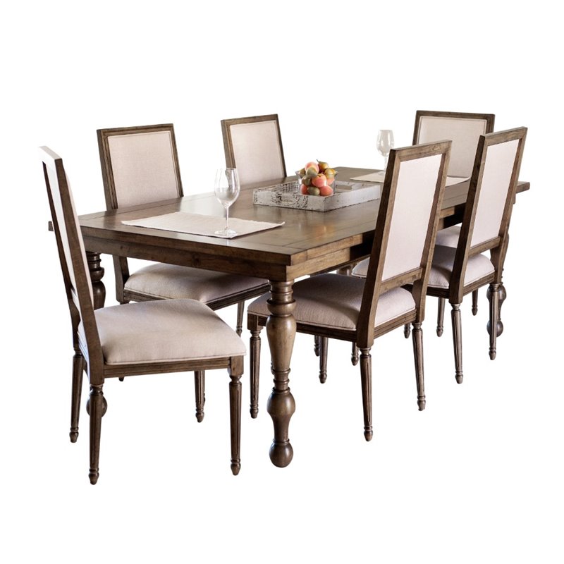 | Abbyson Living - Dining Sets - RK43317PC - Farmhouse style can be yours with this weathered oak dining set. Table features spindle legs and hand carved detail on table top. Upholstered chairs in ivory linen coordinate with any décor. Set includes table and six dining chairs. Coordinating buffet table also available.Finish: Brown; Materials: Solid Rubberwood Construction, Linen Fabric; Finish, Color: Weathered Oak, Cream Linen; 4 curved table legs; Set includes 1 Dining Table, 6 Dining Chairs; Assembly Required. Specifications:Dining Table Dimensions: 20 H x 84 W x 42 D ; Dining Chair Dimensions 42 H x 22 W x 23 D; Product Weight: 122 lbs.